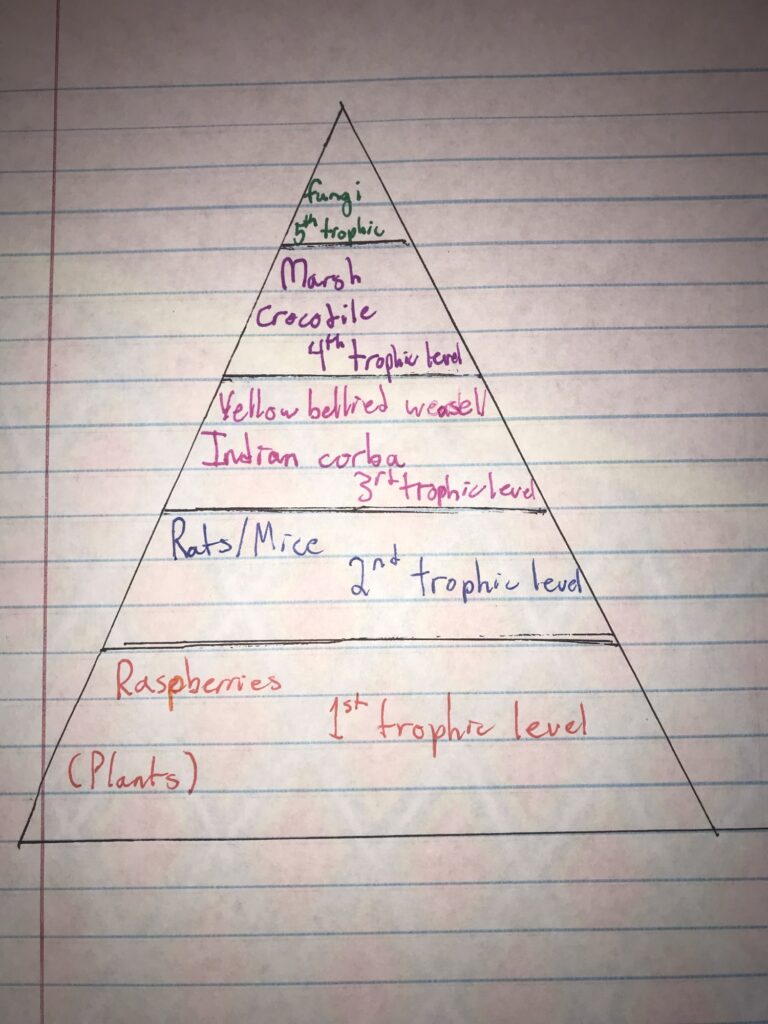 In this pyramid the raspberries are the 1st trophic level. The 2nd trophic level is the rats and the mice. The third trophic level is the yellow bellied weasel and the Indian cobra. The marsh crocodile is the 4th trophic level. Fungi is the 5th trophic level.
