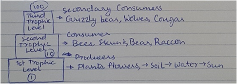 The plant gets its energy from the sun and grows from the water and gets its nutrition from the soil this is known as the producers which can also be defined as the abiotic components. Then the bees get pollen from these plants and goes to other plants pollinating many plants and seeds, the bees play the role of the primary consumers. The bees are consumed by many such as the bear, skunk, and raccoon these can be known as the consumers. Consumers get their energy from the plants or other animals. Then this energy is transferred to the next predators which includes cougar also known by many other names such as mountain lion, the cougars are consumed by wolves, which then is passed on to the grizzly bear. This part of the food web is known as the secondary consumers the secondary consumers get their energy from the consumers.