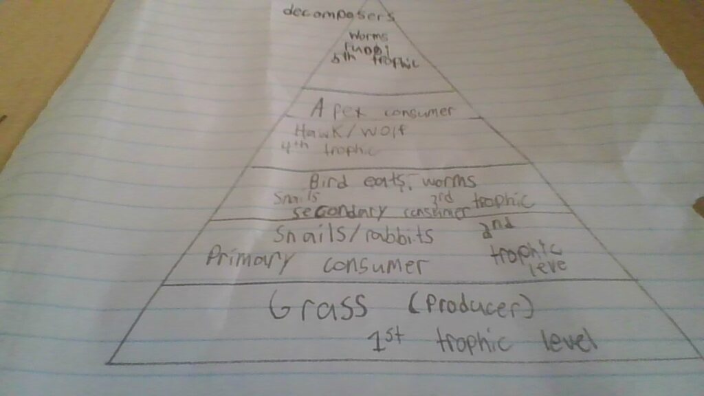 Grass is the plant and it is the first trophic level (producer). Snails and rabbits are next the consume the grass that makes them primary consumers. The bird then eats the snail and worms (secondary consumer). Apex consumer Hawk/Wolf.