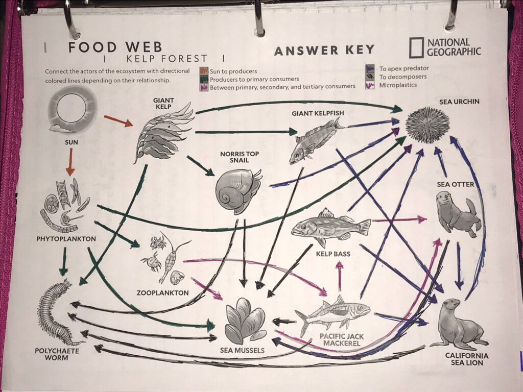 Things that are affected by human activity starts with the giant kelp where the micro plastics land on the giant kelp. the giant kelp is then eaten by the giant kelp fish, the Norris top snail, the sea urchin, and so on and so on forth until every living thing in the ecosystem has micro plastics in them.
